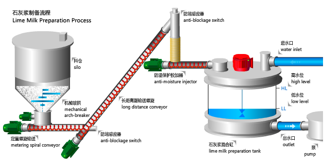 1) 石灰浆被持续泵走,至低水位时,投加系统起动。2) 石灰被提取出料仓,经定量螺旋、副螺旋以及投加器被投加到混合缸与水混合配成石灰浆。3) 至高水位,系统自动停止。至低水位时,系统再次自动起动投加石灰。