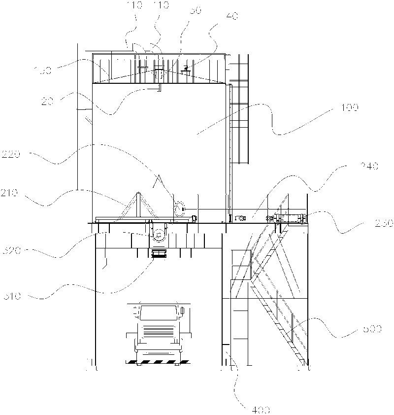 3.根据权利要求1所述的污泥滑架料仓,其特征在于,所述料仓桶体(100)的下部吊装于钢支架(400)上,所述料仓桶体(100)外侧还设置有爬梯(500)。