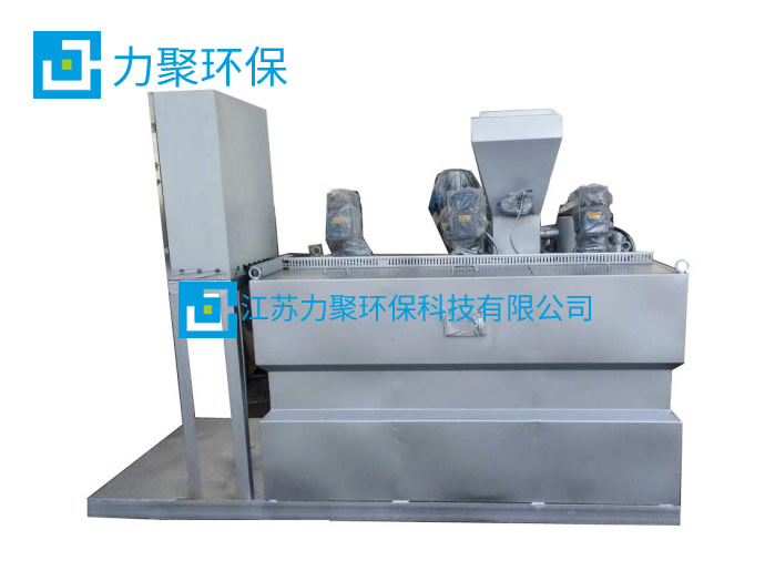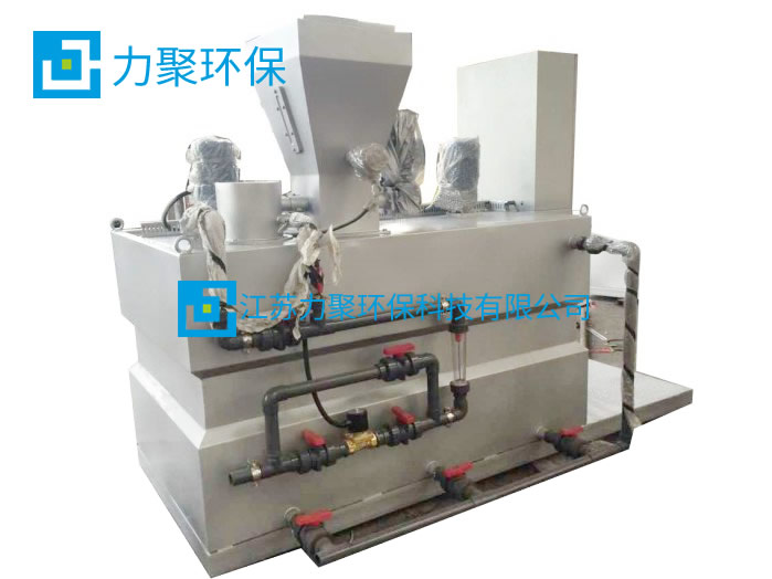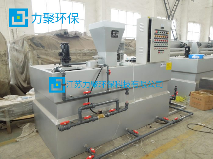 干粉倒入干粉进料机的料斗,通过改变进料电机的转速来精确控制进药量。干粉由投配螺旋经过输料管推入到混合器中,输料管的电热带能使里面的干粉避免受潮结块堵塞输料管。进入混合器中的干粉立刻被稀释水润湿,并滑入制备槽,制备槽中有电动搅拌器,初步混和药液,然后药液再流入熟化槽,在其内充分混和并熟化,熟化后的药液,流入投配槽中,为防止熟化的药液发生沉淀,投配槽中的搅拌器在停止制备药液时进行间歇搅拌。